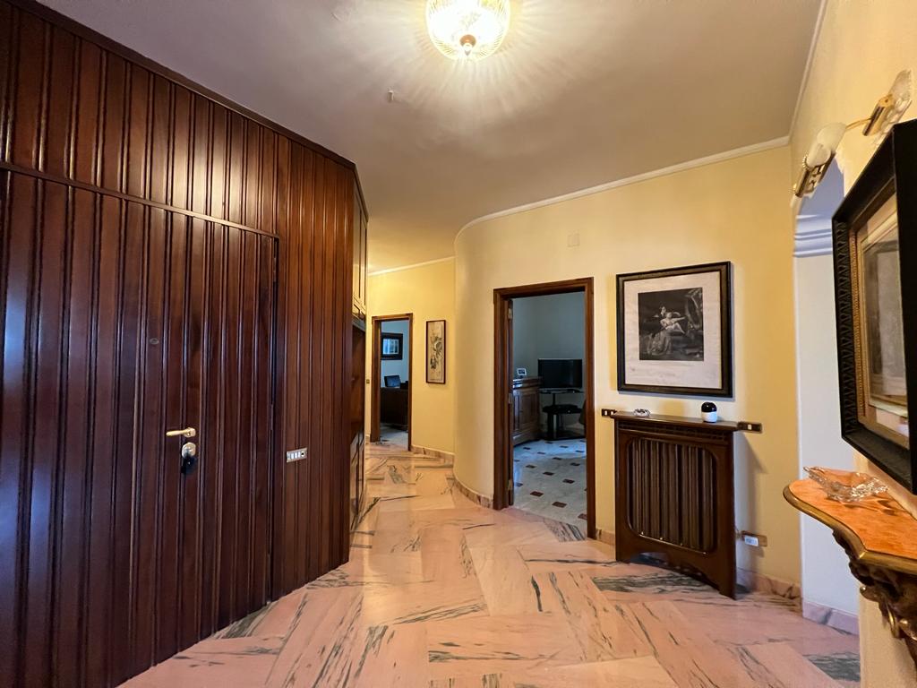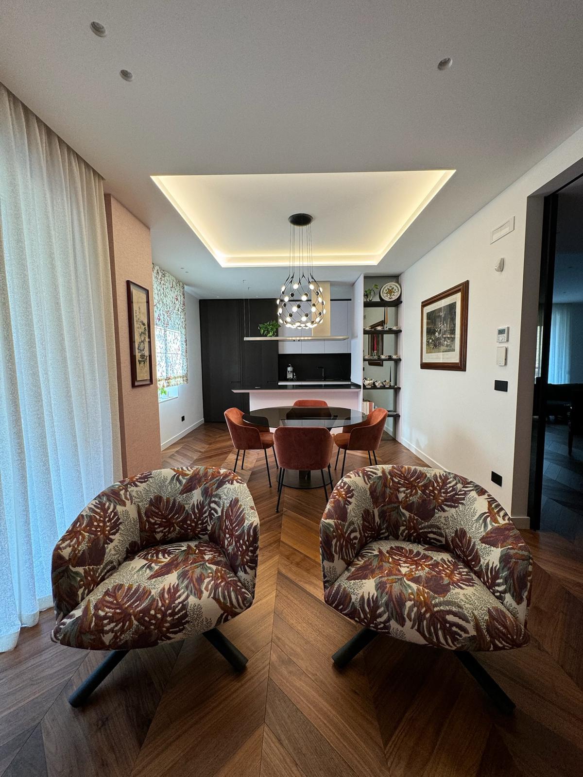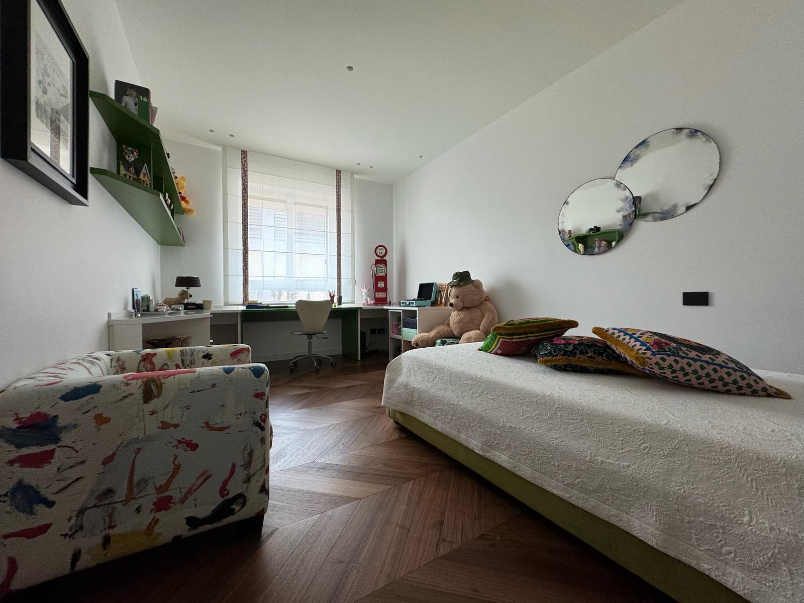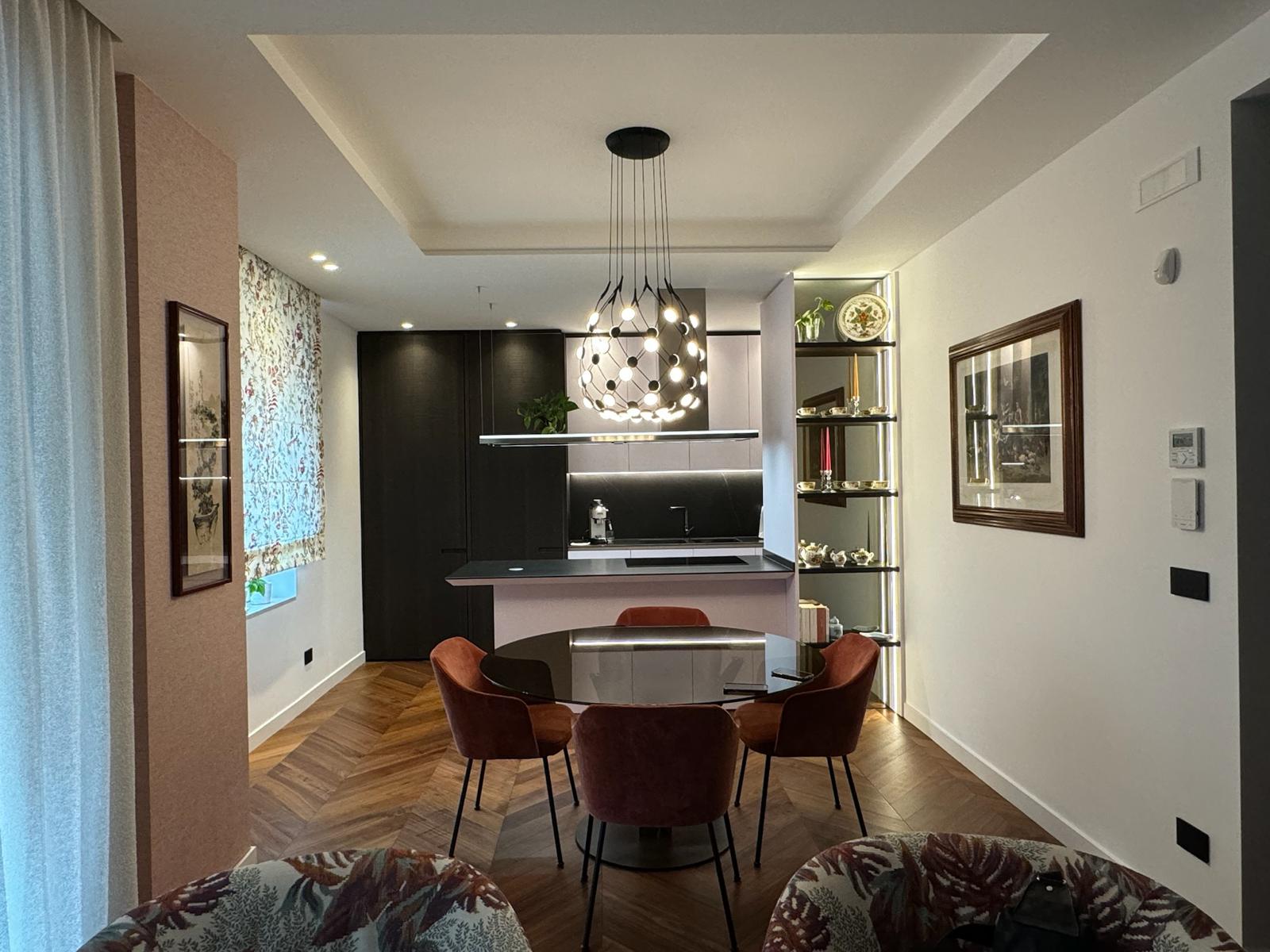 La cucina con affaccio sulla zona giorno consente alla padrona di casa e non solo, di essere attiva e partecipe nei momenti in cui tutta la famiglia è riunita durante il pranzo e no. Non mancano comodi ambienti di servizio come cabina armadio, ripostiglio e dispensa di cucina perfettamente mimetizzati da boiserie e porte specchiate. La luce è misurata secondo le necessità dei percorsi, degli scenari quotidiani e dall’interesse di valorizzare alcuni oggetti d’arte.