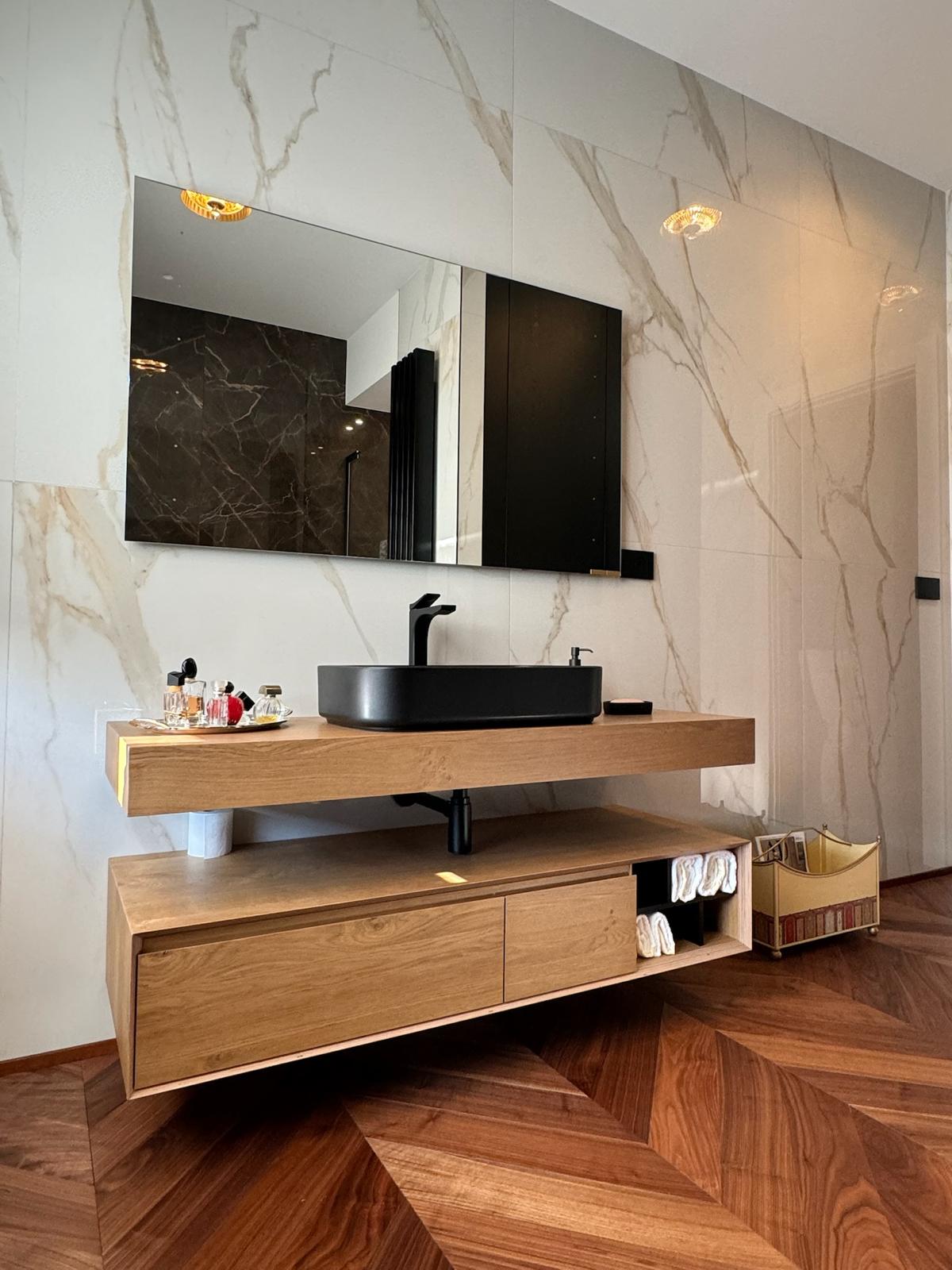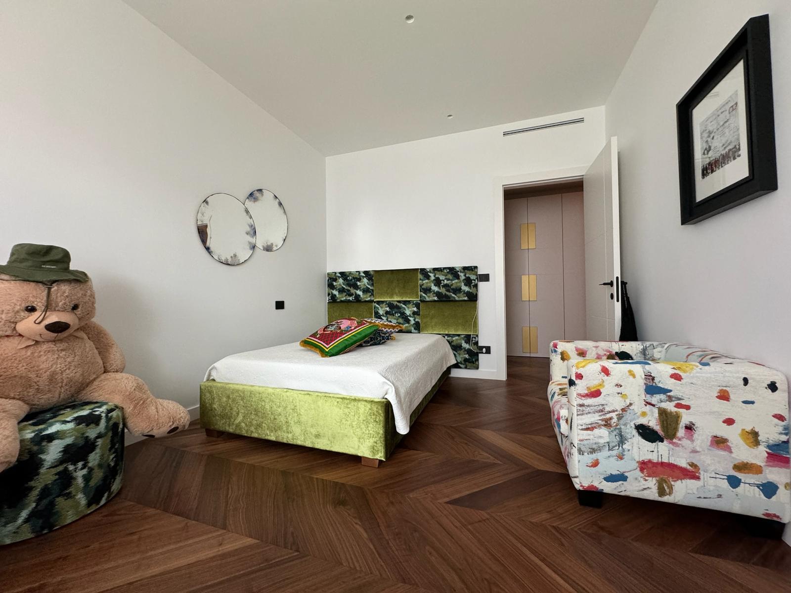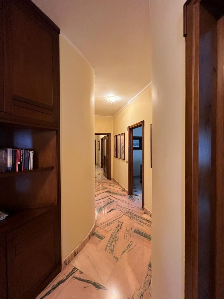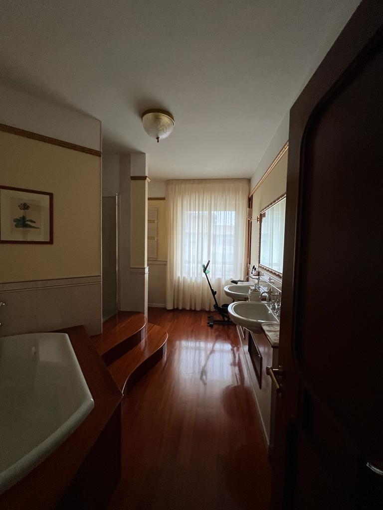 La cucina con affaccio sulla zona giorno consente alla padrona di casa e non solo, di essere attiva e partecipe nei momenti in cui tutta la famiglia è riunita durante il pranzo e no. Non mancano comodi ambienti di servizio come cabina armadio, ripostiglio e dispensa di cucina perfettamente mimetizzati da boiserie e porte specchiate. La luce è misurata secondo le necessità dei percorsi, degli scenari quotidiani e dall’interesse di valorizzare alcuni oggetti d’arte.