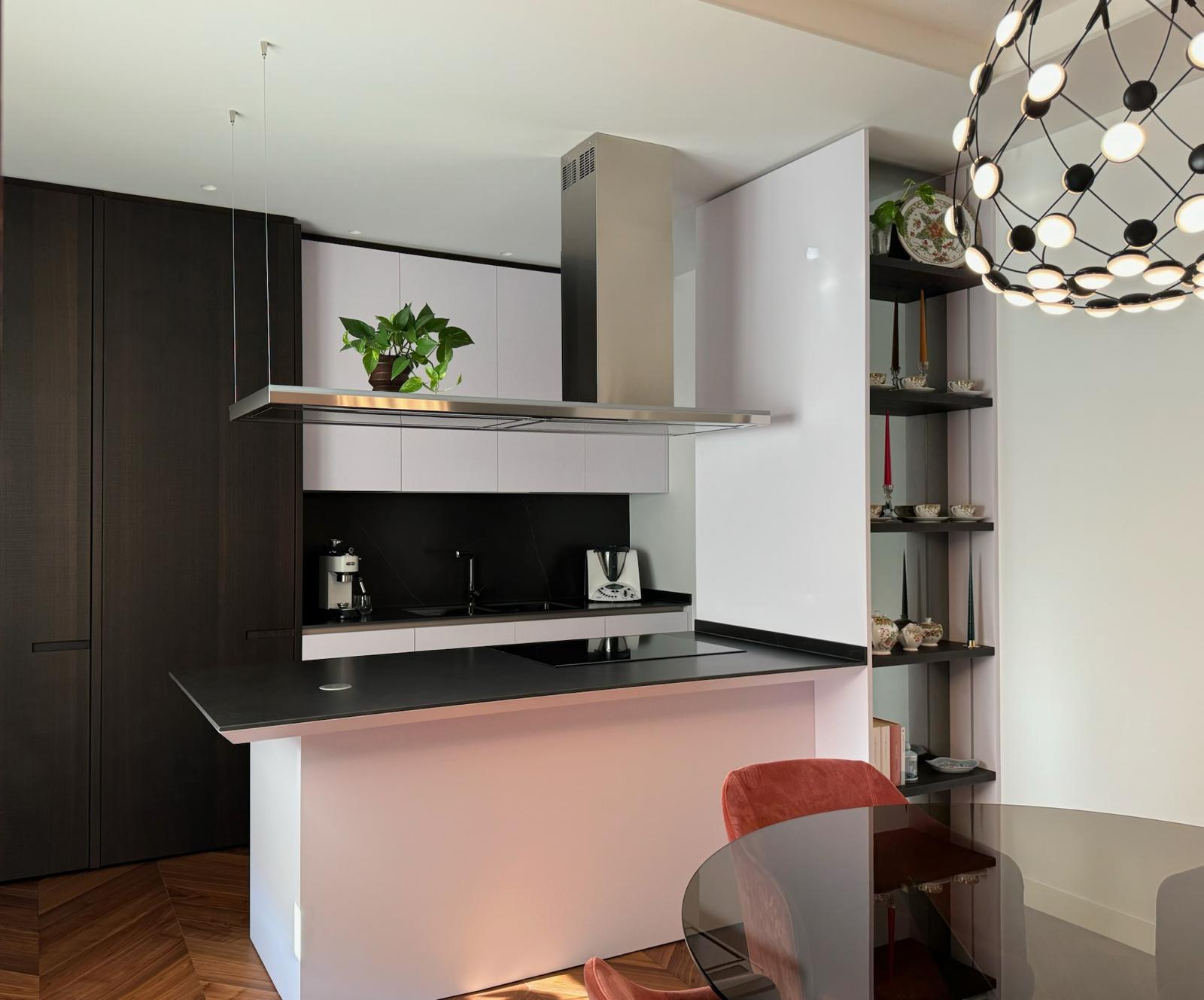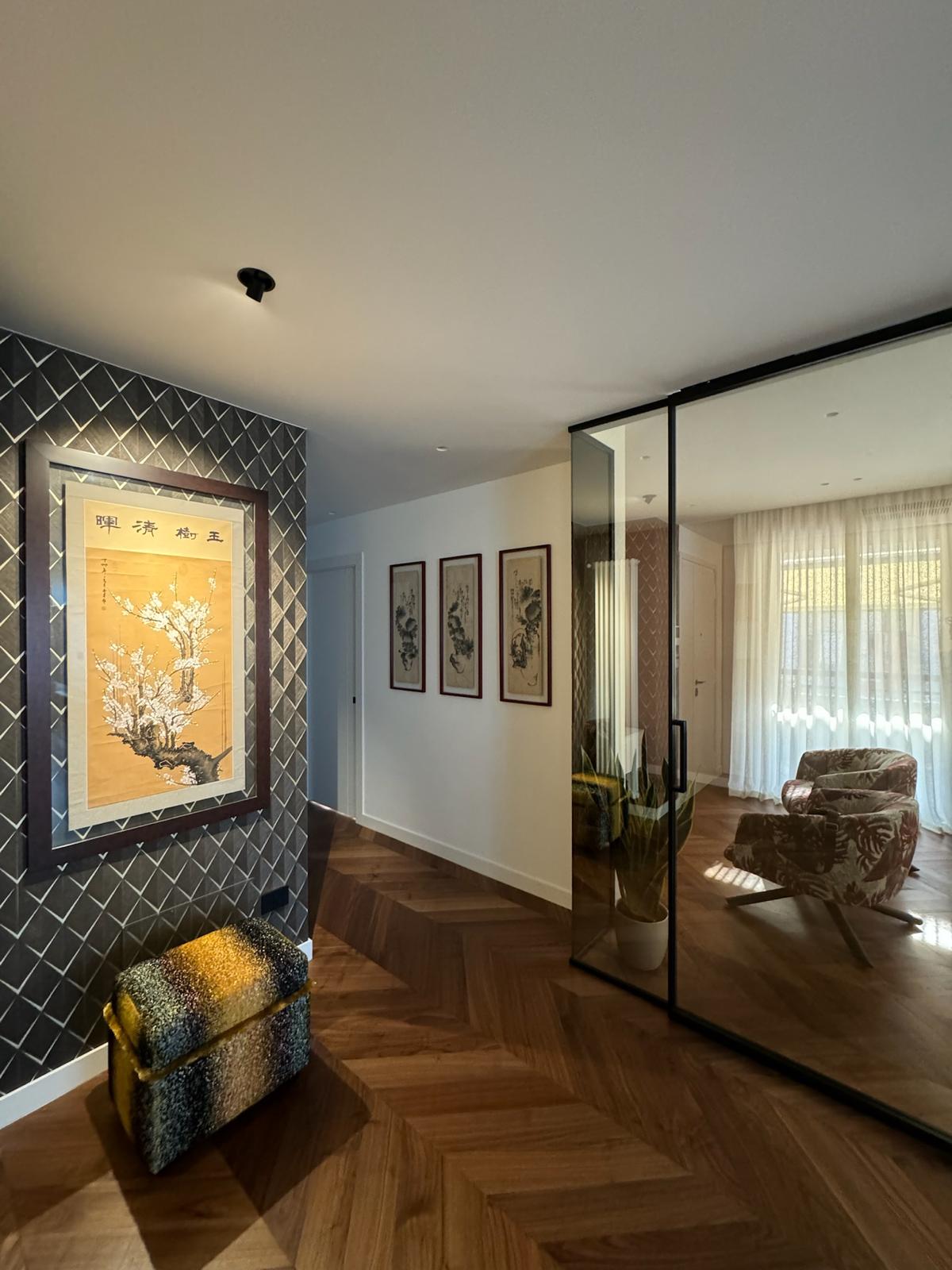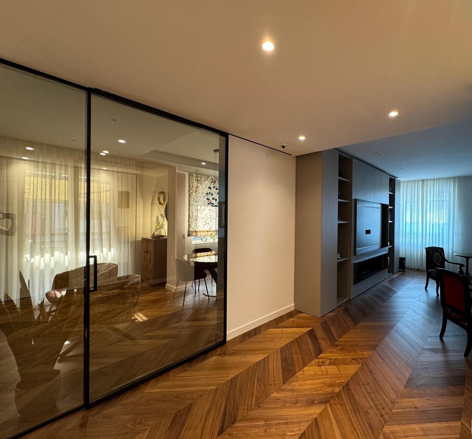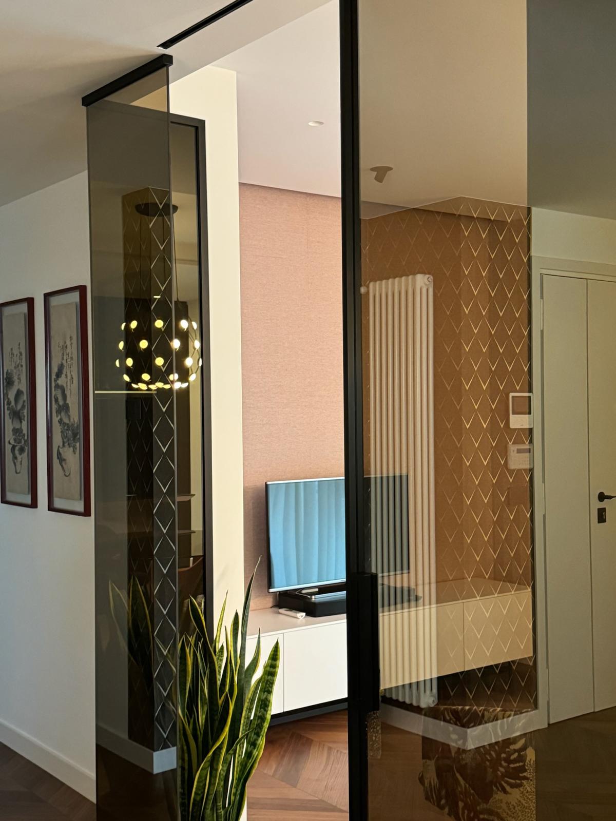 Un caldo parquet in noce americano posato a spina ungherese ha sostituito un marmo rosa del Portogallo. Lo spazio della zona giorno è allo stesso tempo aperto e diviso da una grande parete in vetro con porta scorrevole integrata che ha sostituito pareti in muratura dilatando notevolmente lo spazio e godendo della luce naturale sin da quando si è accolti in casa. Un ampio squarcio a tutt’altezza introduce nel salotto di casa garantendo la privacy voluta dai proprietari.