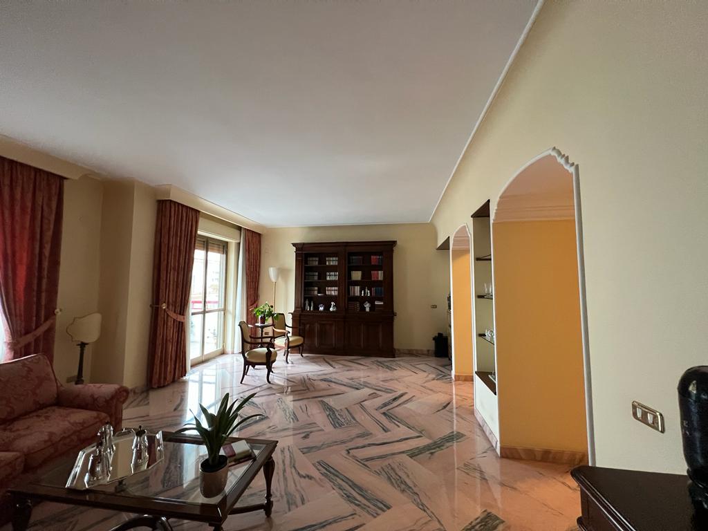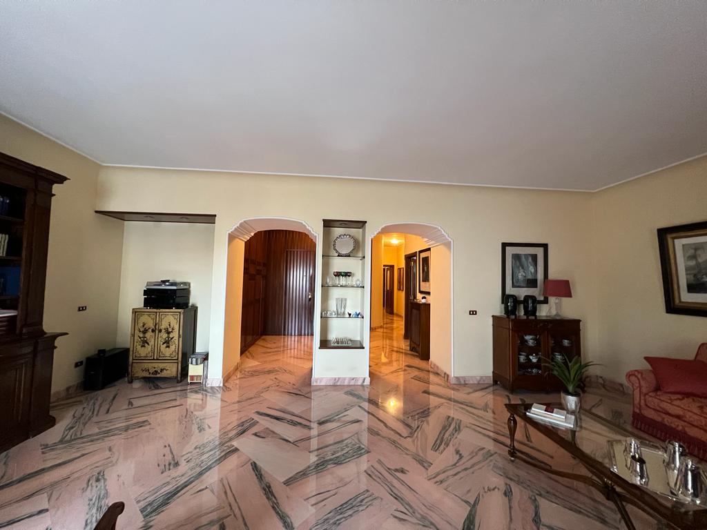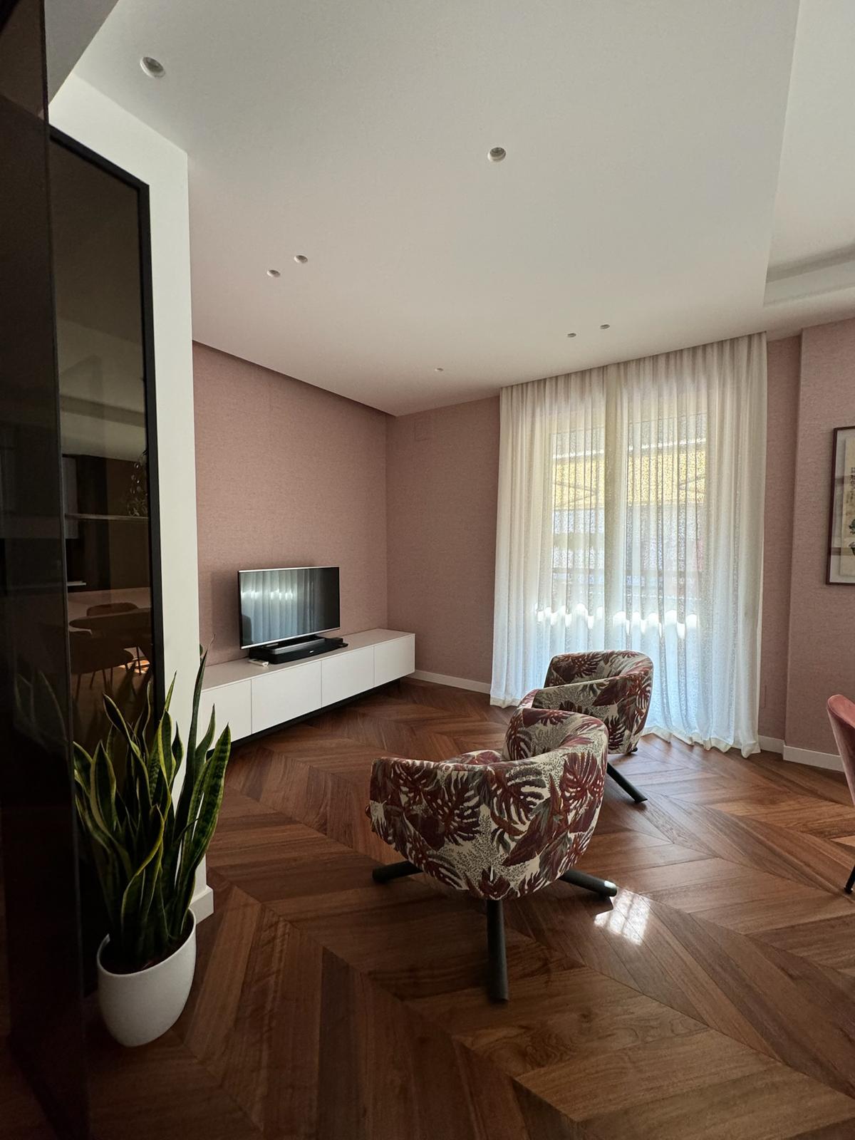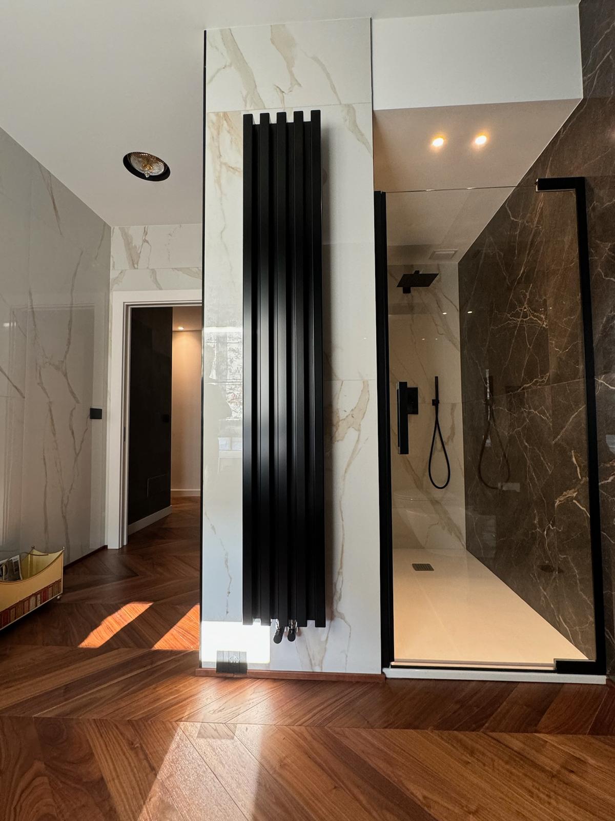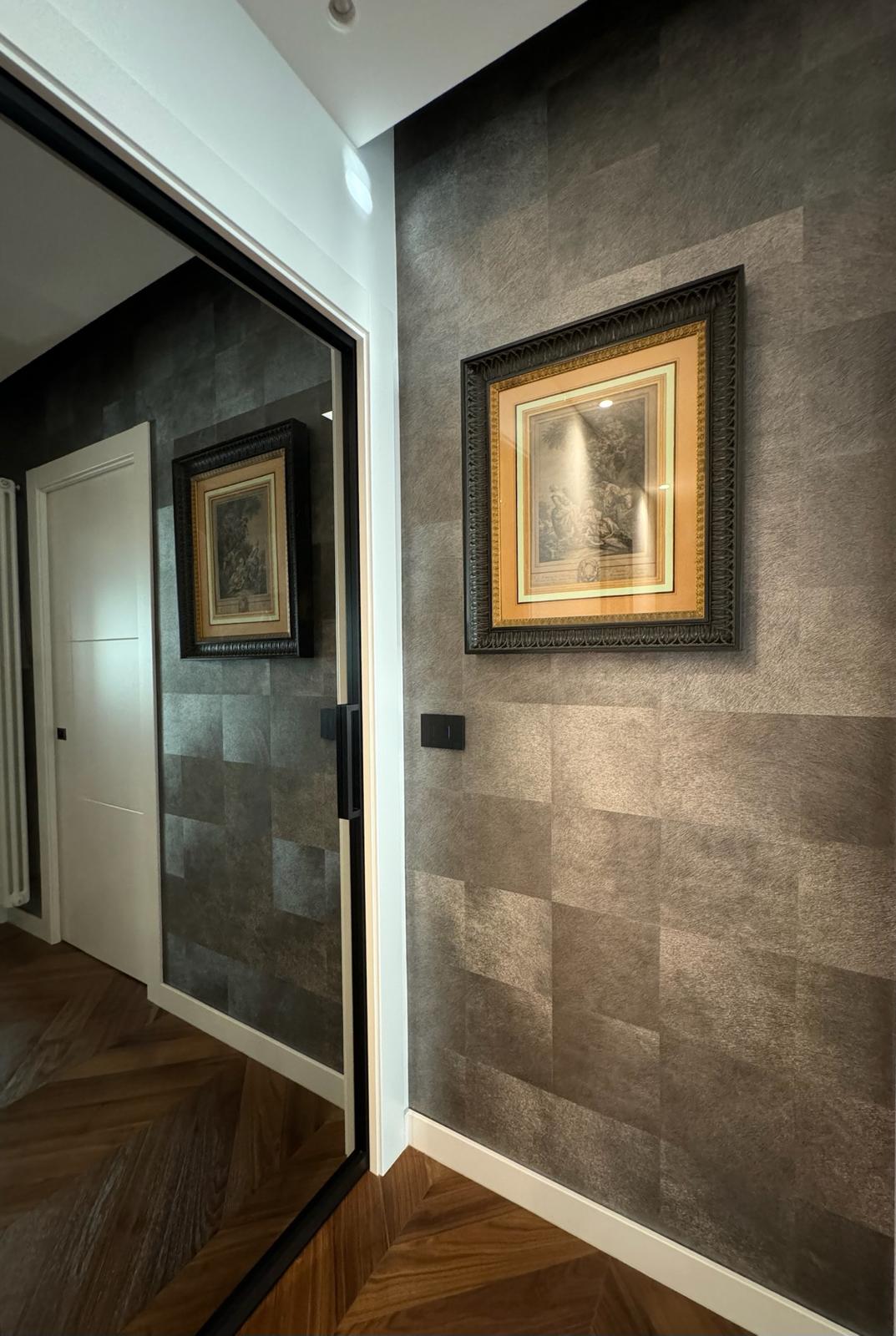 Un caldo parquet in noce americano posato a spina ungherese ha sostituito un marmo rosa del Portogallo. Lo spazio della zona giorno è allo stesso tempo aperto e diviso da una grande parete in vetro con porta scorrevole integrata che ha sostituito pareti in muratura dilatando notevolmente lo spazio e godendo della luce naturale sin da quando si è accolti in casa. Un ampio squarcio a tutt’altezza introduce nel salotto di casa garantendo la privacy voluta dai proprietari.