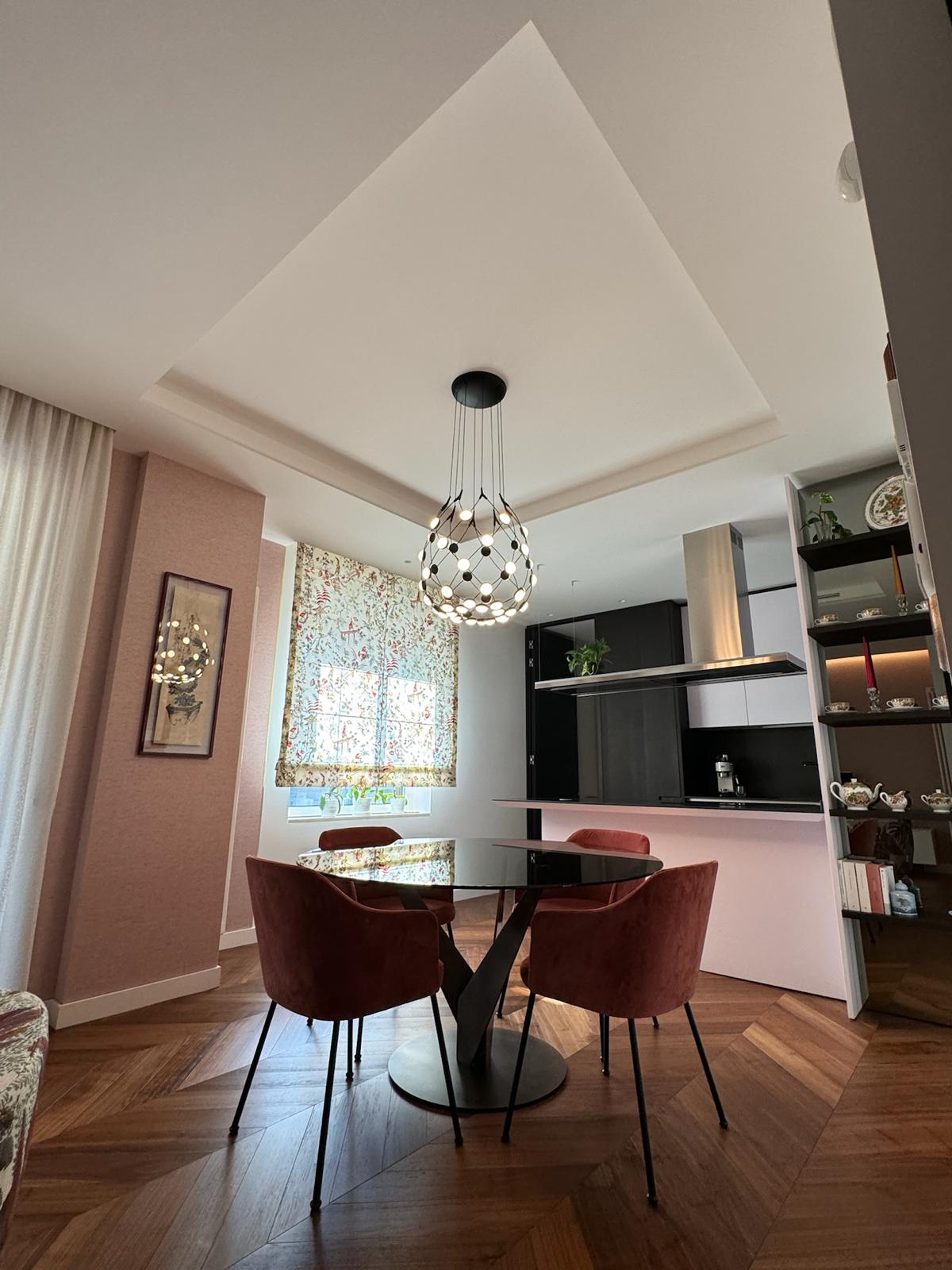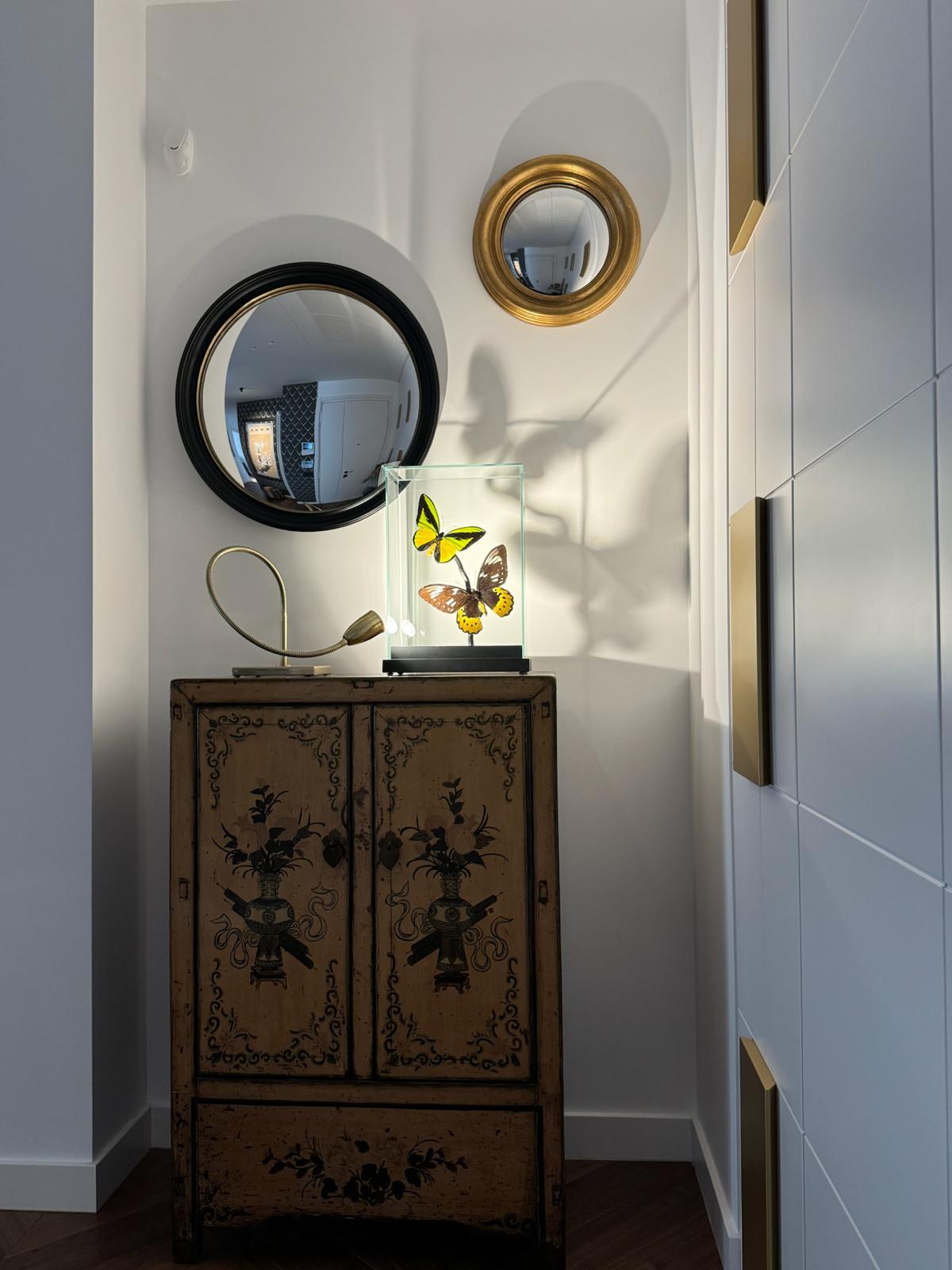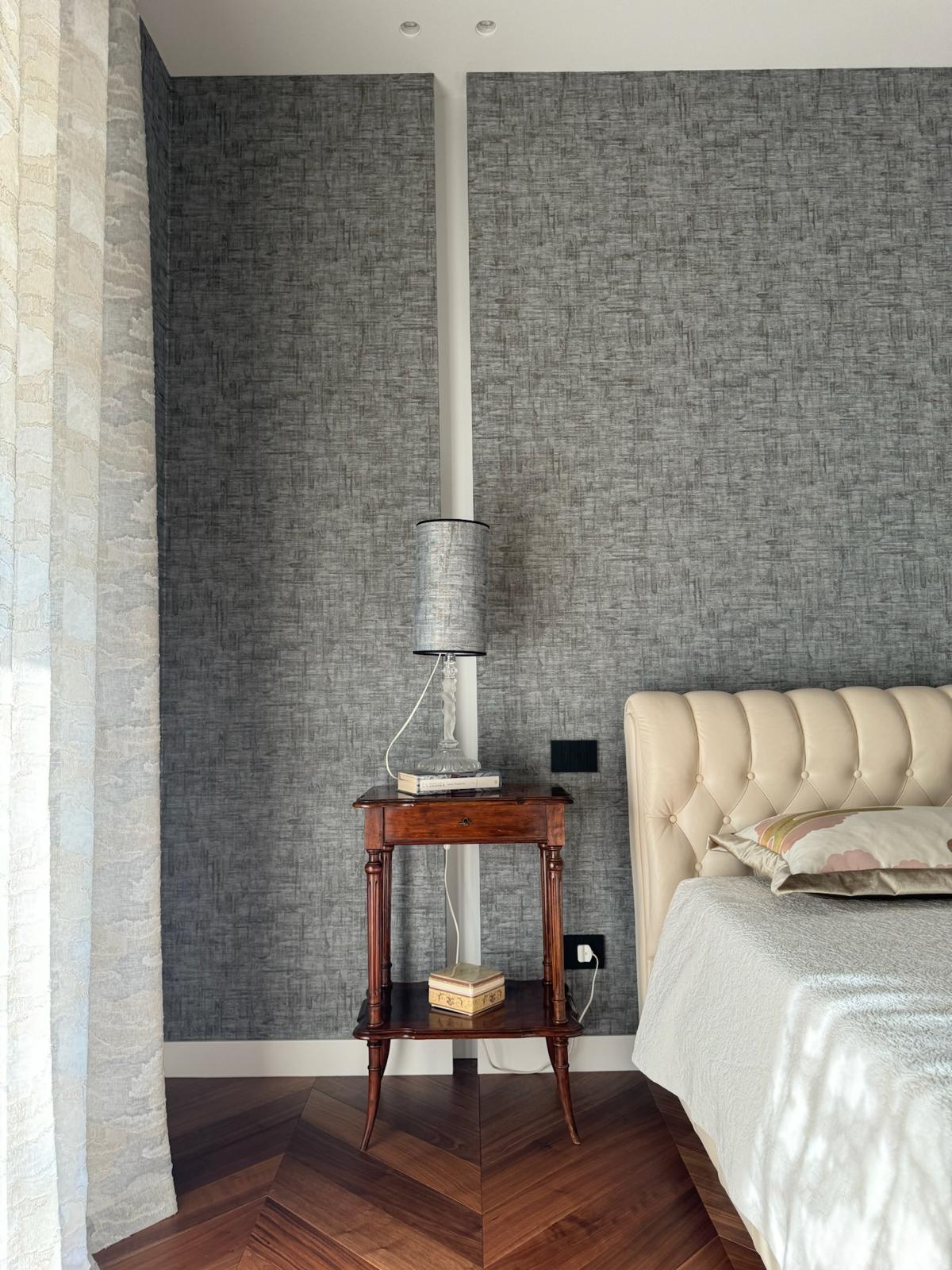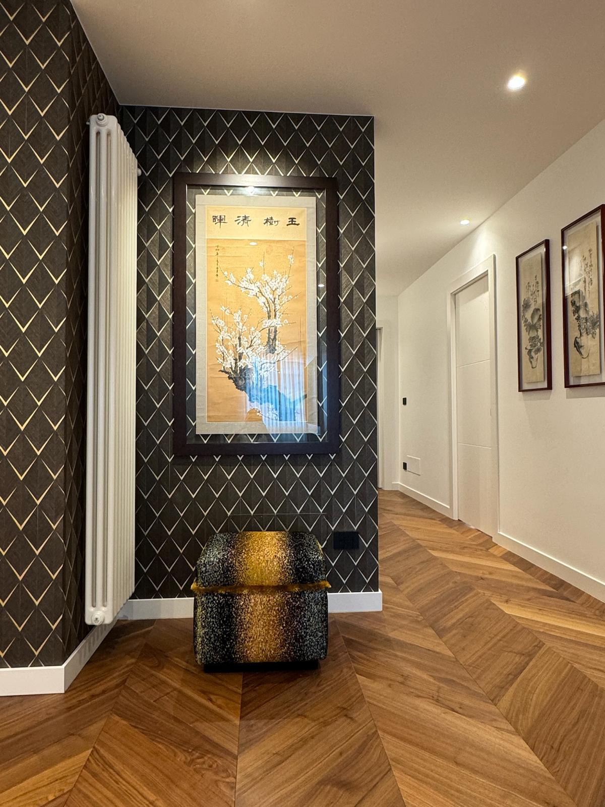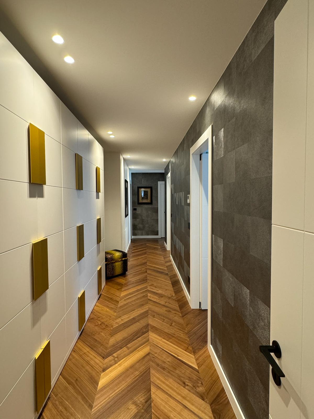 Il fil rouge del progetto è stato il colore bianco e oro che ritroviamo nelle porte, nelle armadiature e nei dettagli architettonici. Un’accurata selezione di carte da parati posate con misurata leggerezza, caratterizza tutto l’appartamento dall’ingresso alle camere da letto, alla zona pranzo e ai corridoi.